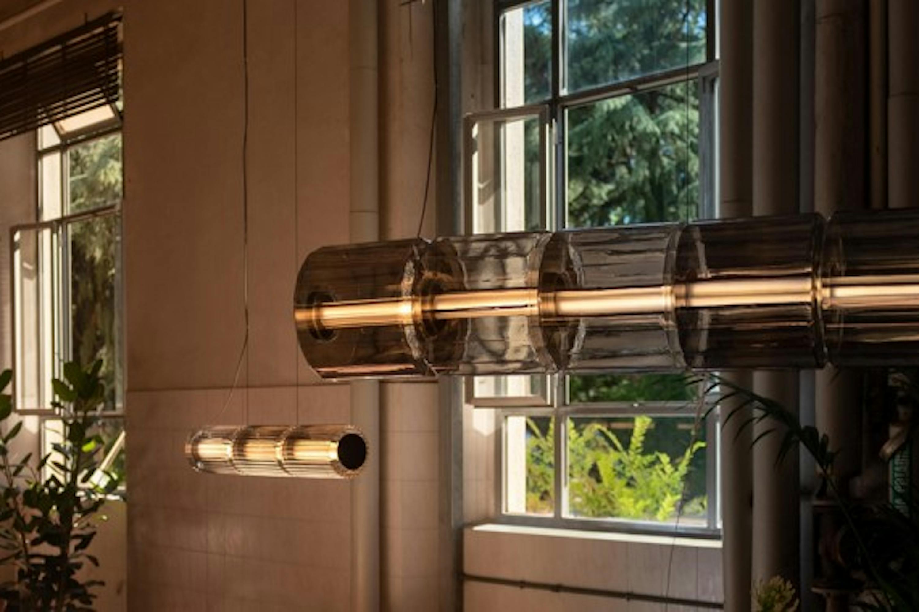 The faceted surface of the column mimics the fluting used on buildings and temples to create a sense of rhythm, which softly diffuses the light as it radiates into the space.