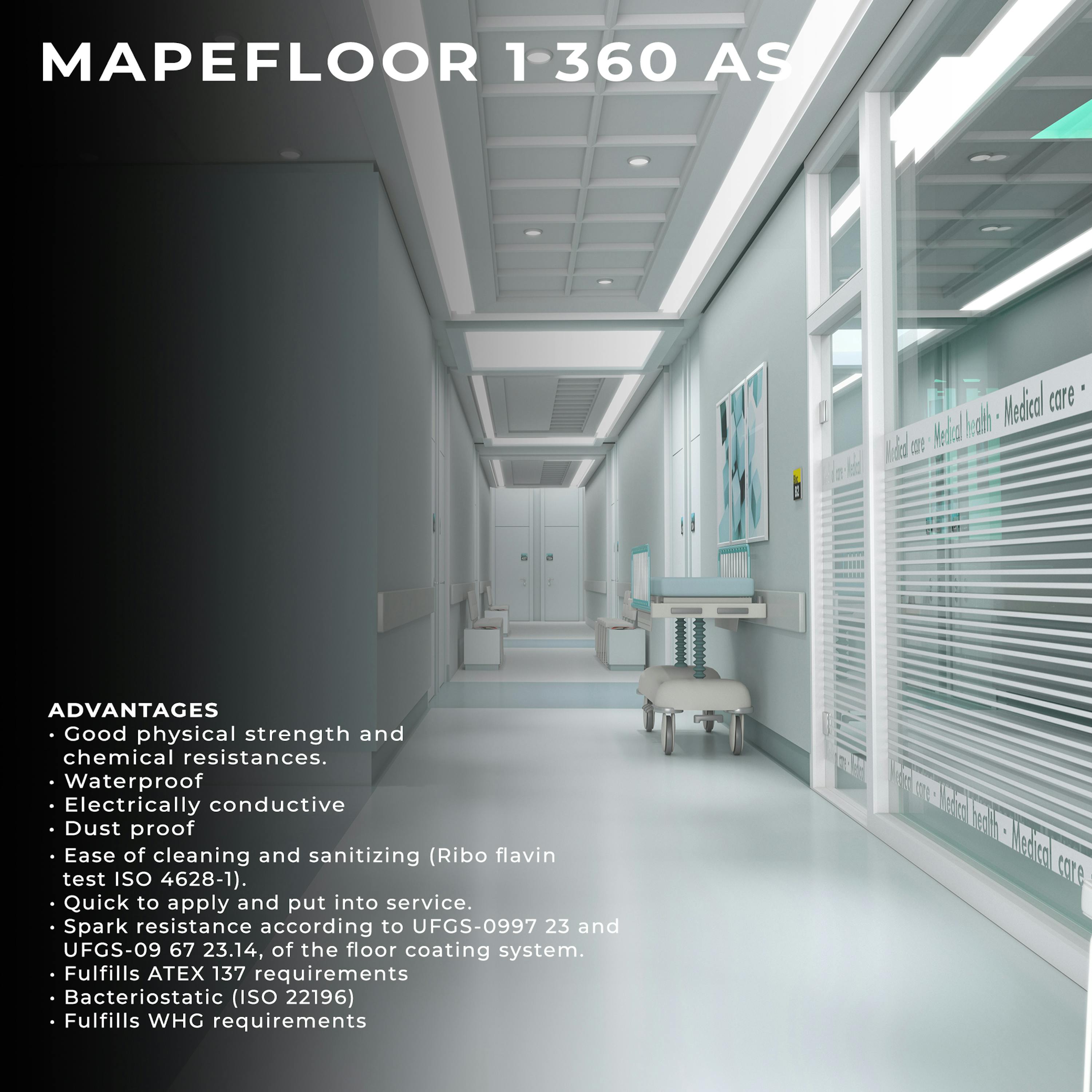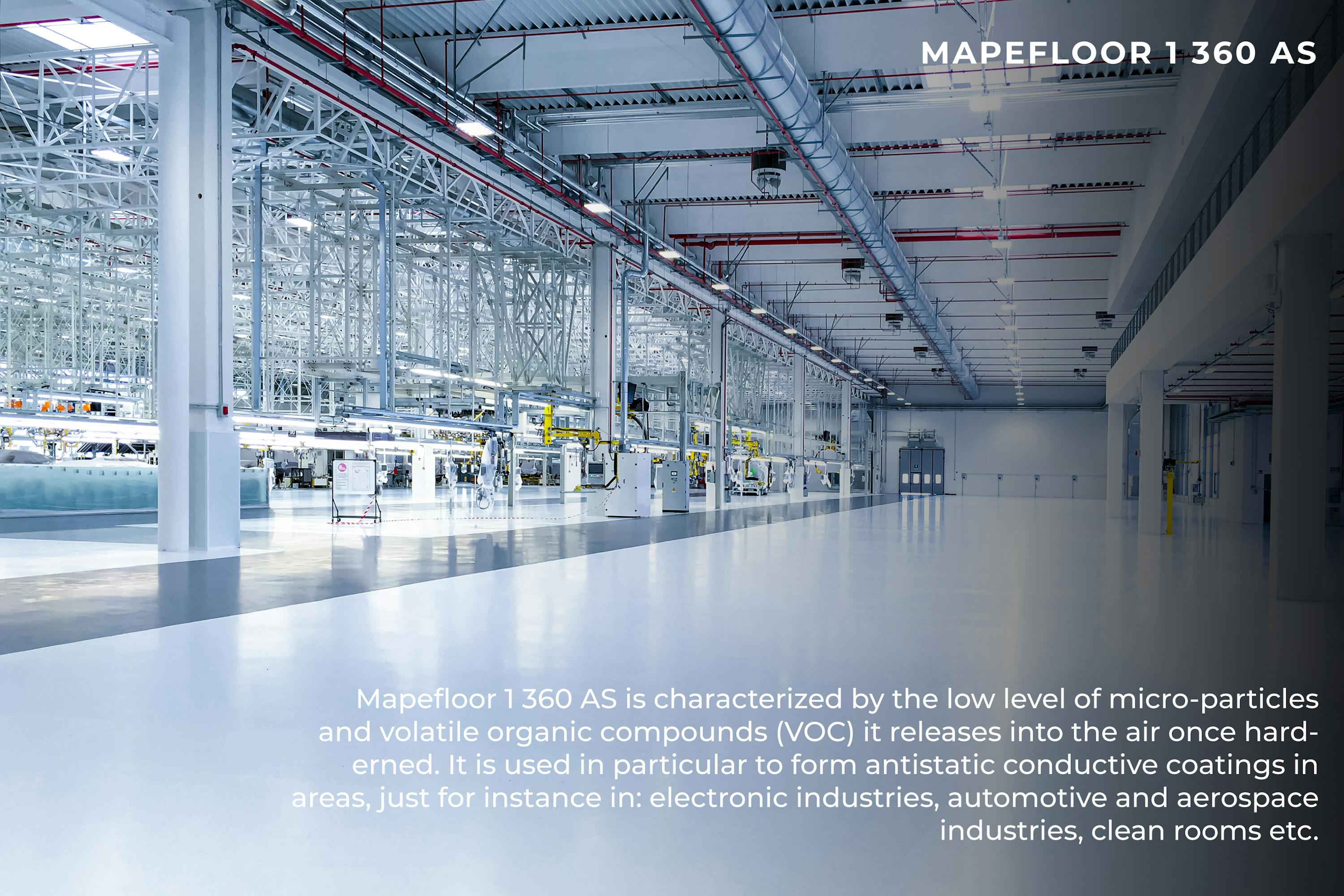 Mapefloor I 360 AS is used to form electrically conductive coatings on concrete substrates and cementitious screeds exposed to medium to heavy traffic. It is a two-component, self-levelling epoxy formulate used to form strong, anti-static, conductive coatings with good mechanical and chemical resistances. Once hardened, Mapefloor I 360 AS is characterized by the low level of micro-particles and volatile organic compounds (VOC) it releases into the air. This makes it particularly suitable for coating floors in areas such as clean rooms where a high standard of hygiene is required.
