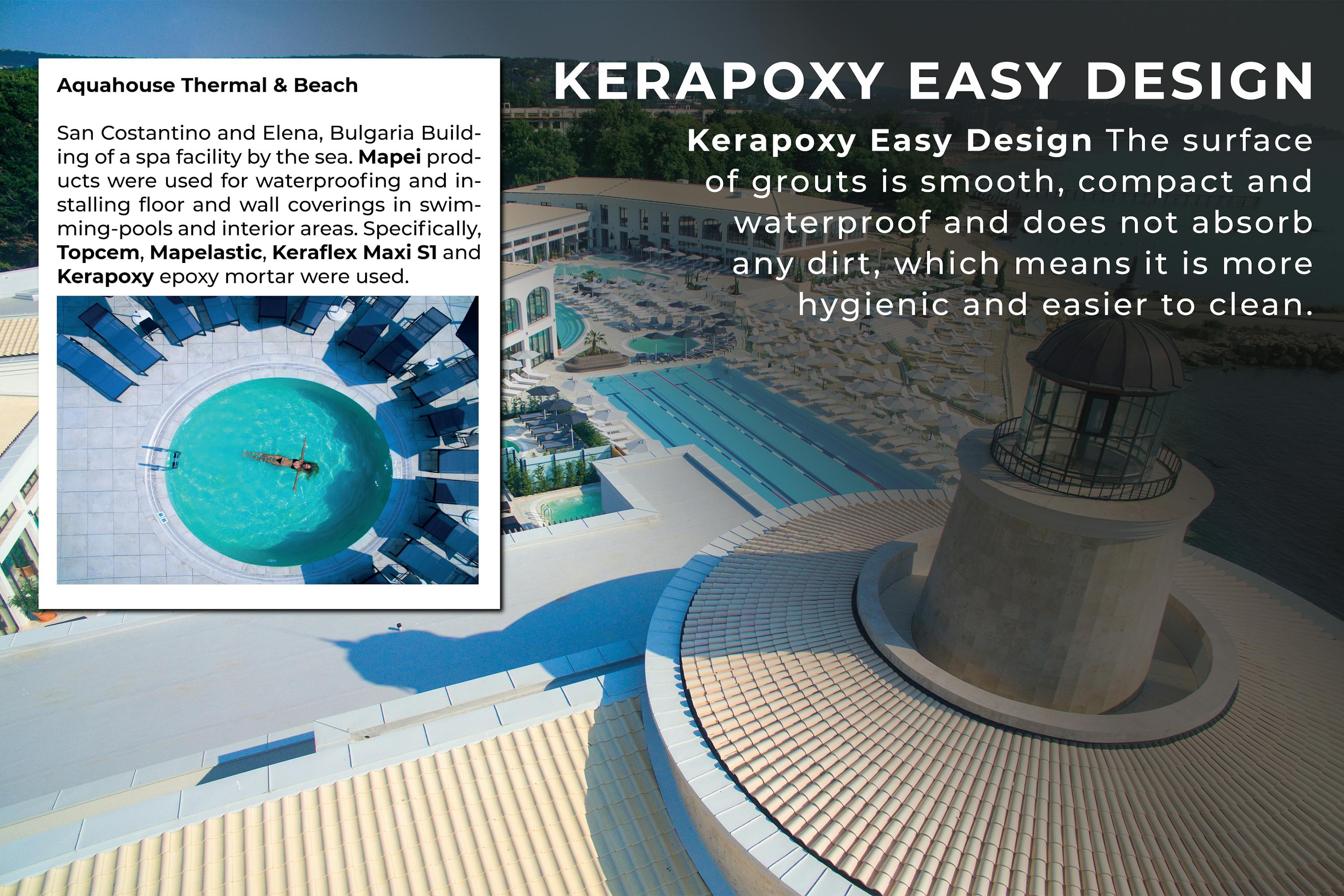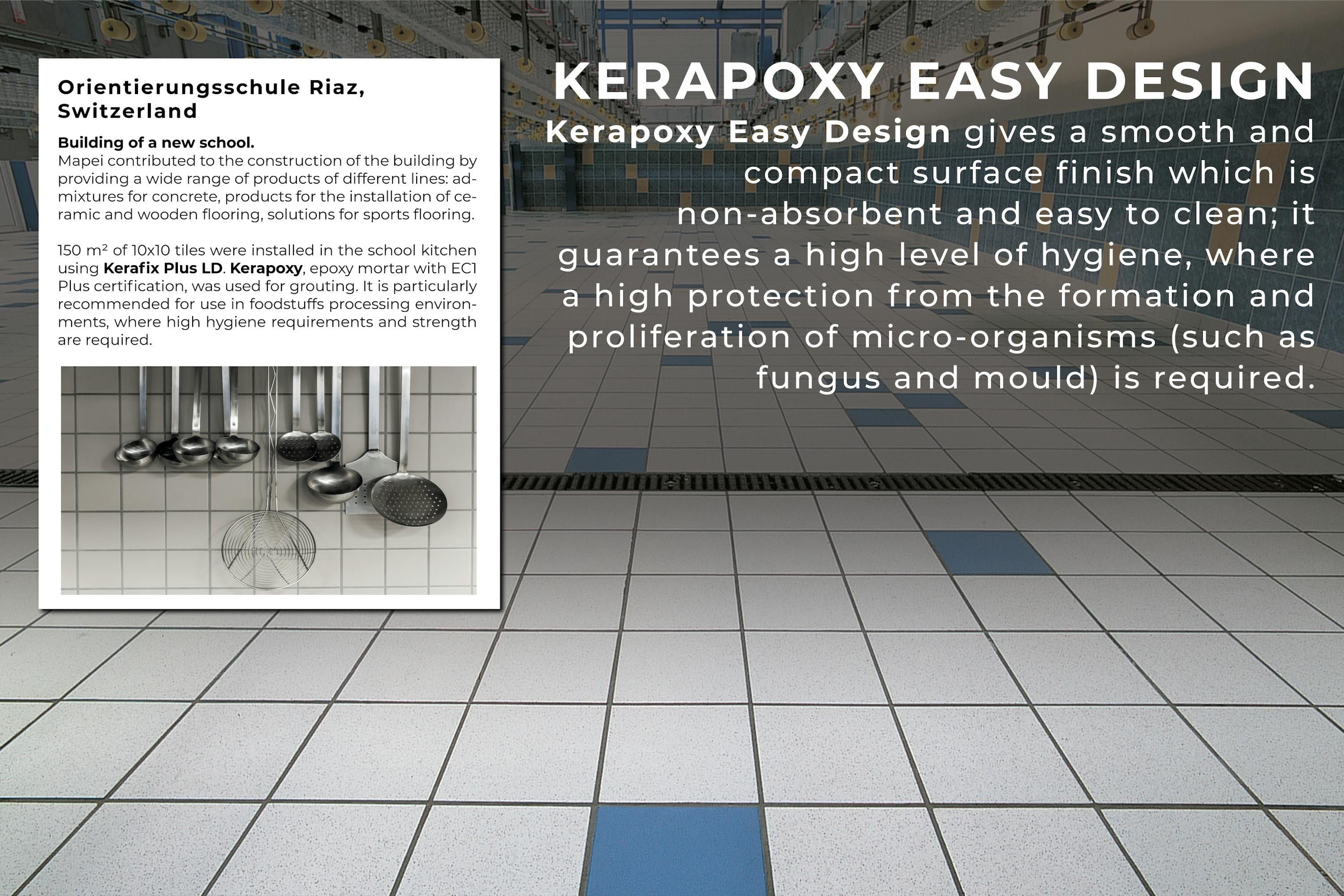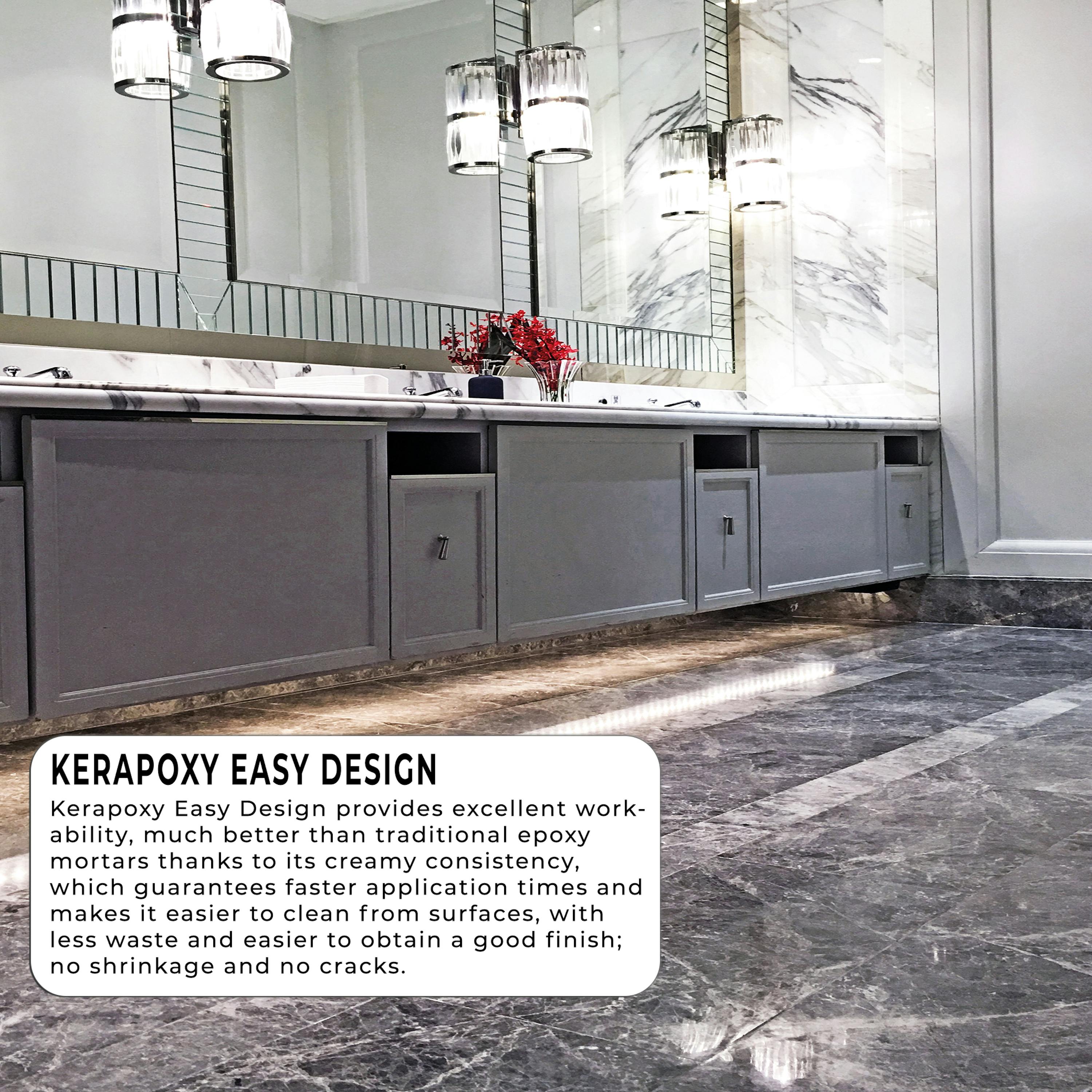 Kerapoxy Easy Design is a two-component, versatile, decorative, acid-resistant epoxy grout, with a bacteriostatic agent and BioBlock® technology, easy to apply and clean, ideal for grouting ceramic tiles, glass mosaics and stone materials, to be used also in combination with MapeGlitter and Mapecolor Metallic. For grouting joints from 1 to 15 mm wide. Can also be used as an adhesive. It is also certified by INDUSTRIAL MICROBIOLOGICAL SERVICE LTD (England) according to ISO 22196:201 standards as a grouting mortar protected against the formation and proliferation of micro-organisms.