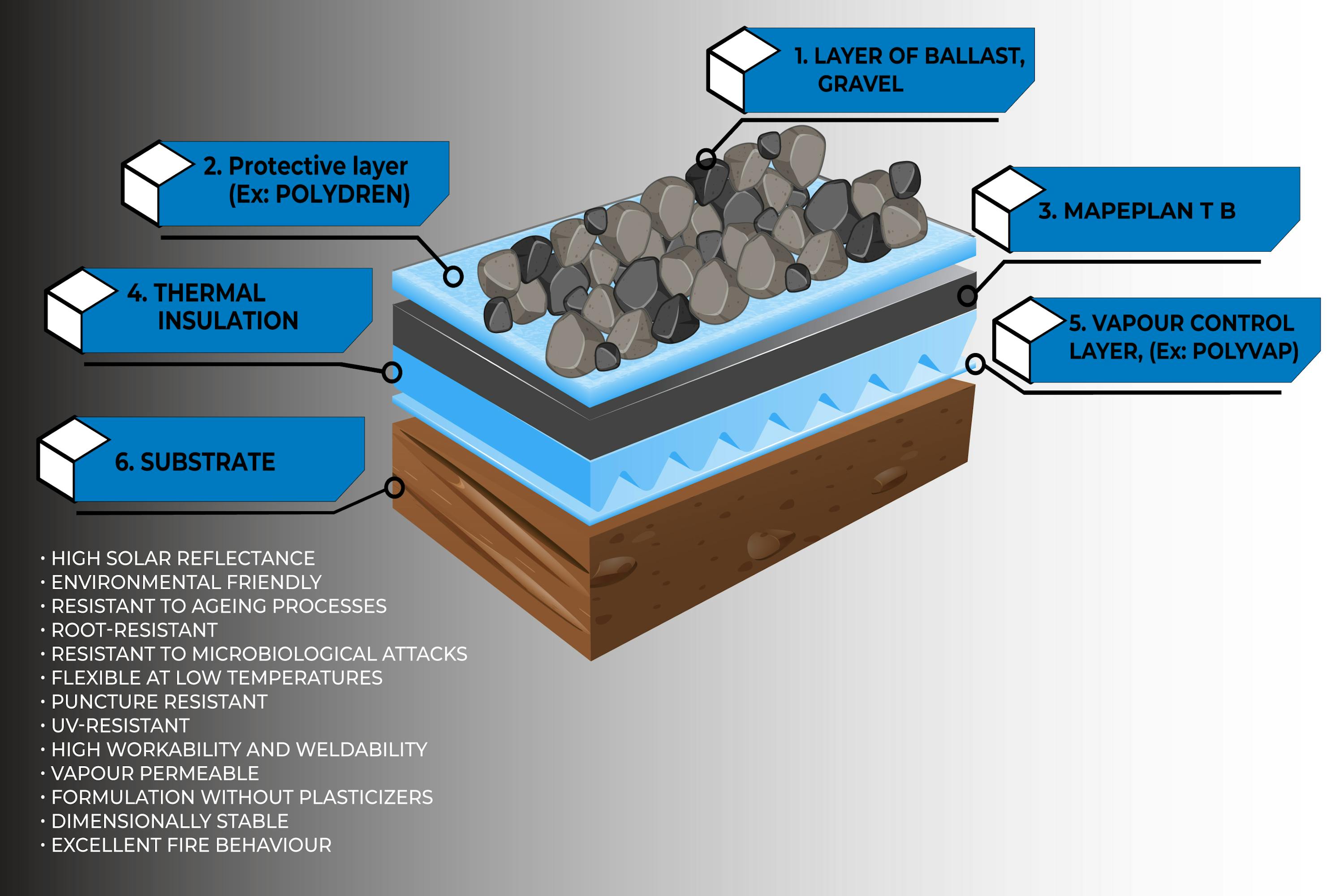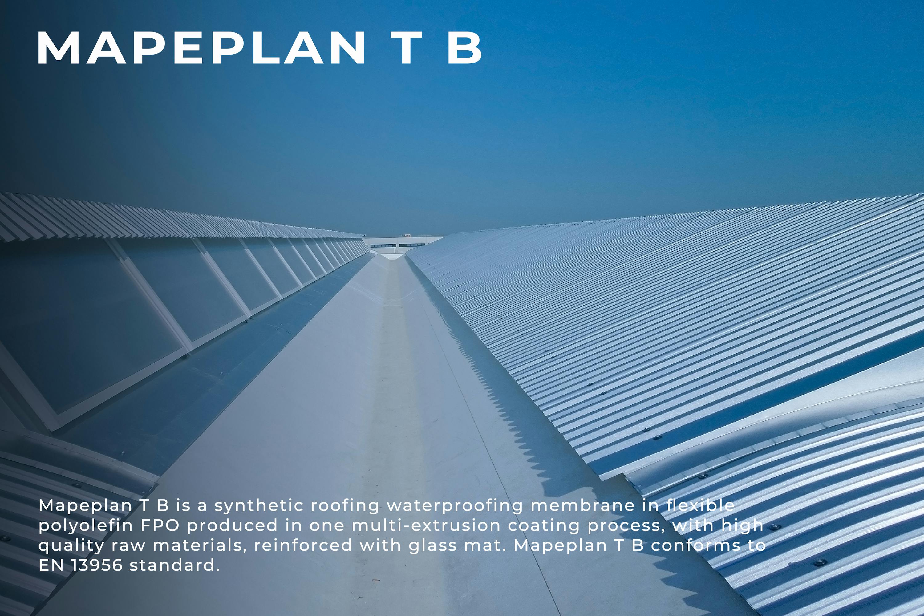 Mapeplan T B is a synthetic roofing waterproofing membrane in flexible polyolefin FPO produced in one multi-extrusion coating process, with high quality raw materials, reinforced with glass mat. Mapeplan® T B is conform to EN 13956 standard. Is suitable for loose laid ballasted, utility deck (pedestrian - parking) and roof garden systems. It is resistant to ultraviolet rays.