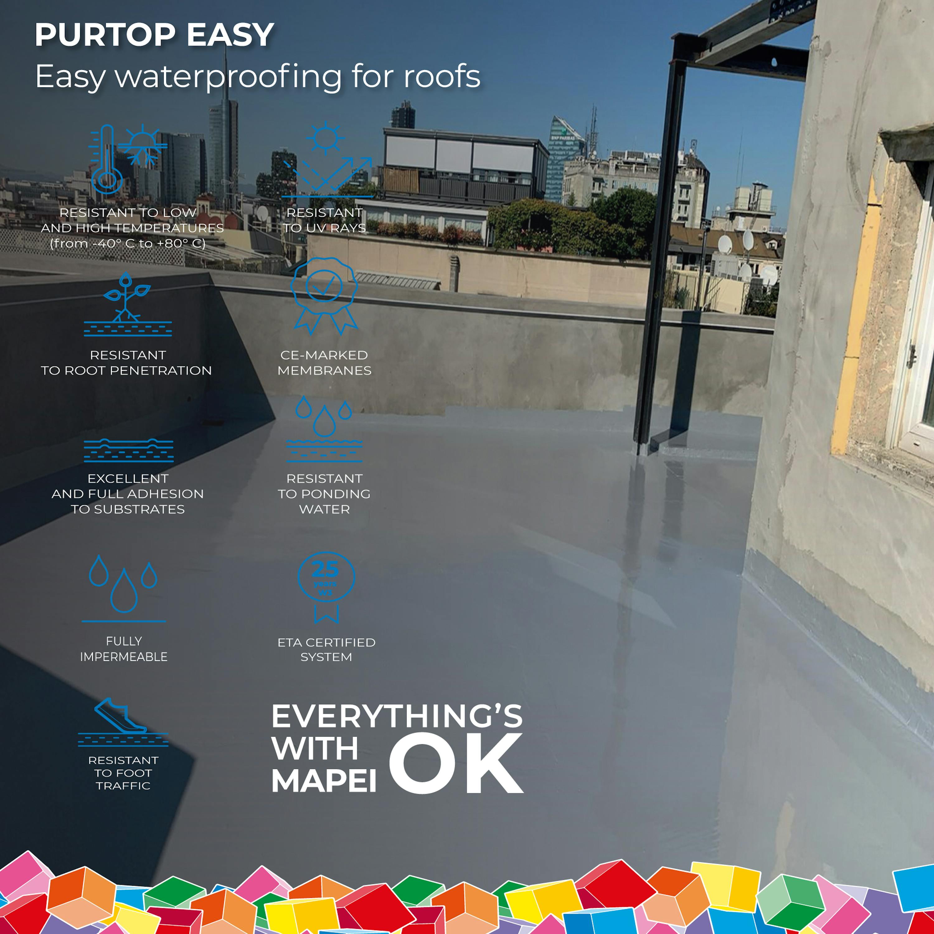 Purtop Easy is a range of ready-to-use polyurethane products by Mapei for waterproofing balconies and terraces with just one single coat. The high elasticity and excellent bond-strength to substrates of these particular products make them ideal for both new builds and old floors, rapidly guaranteeing a perfect waterproofing solution. Their versatility also allows each installer to choose their preferred application method: with a trowel, roller or by spray.