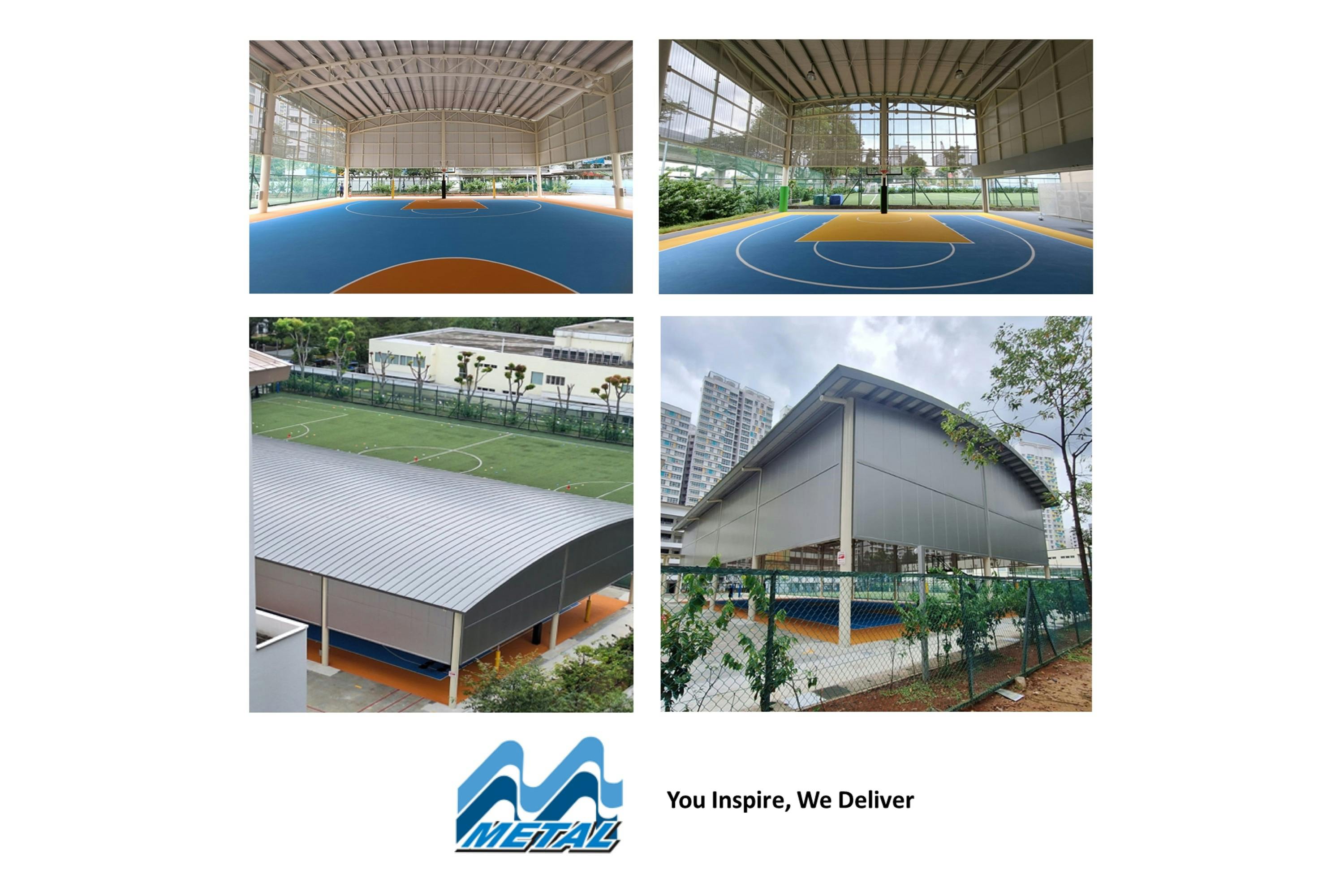 M Metal M-Seam 530® double-skin roofing system was introduced in MOE 19 schools recently to construct covered courts and multi-purpose halls in various locations across Singapore. The beauty of M Seam enhances the aesthetic in its sleek roofing profile with natural curved capability. M Seam 530/505® is popular in institutional, residential and commercial projects due to its aesthetic appearance. The vertical cladding is manufactured in M Span 925® corrugated profile with perforation functioned as rain/sun shield. Perforated M Span 925® allows natural daylight emit into the courts instead of artificial lighting. Proudly supplied & installed by M Metal Pte Ltd.