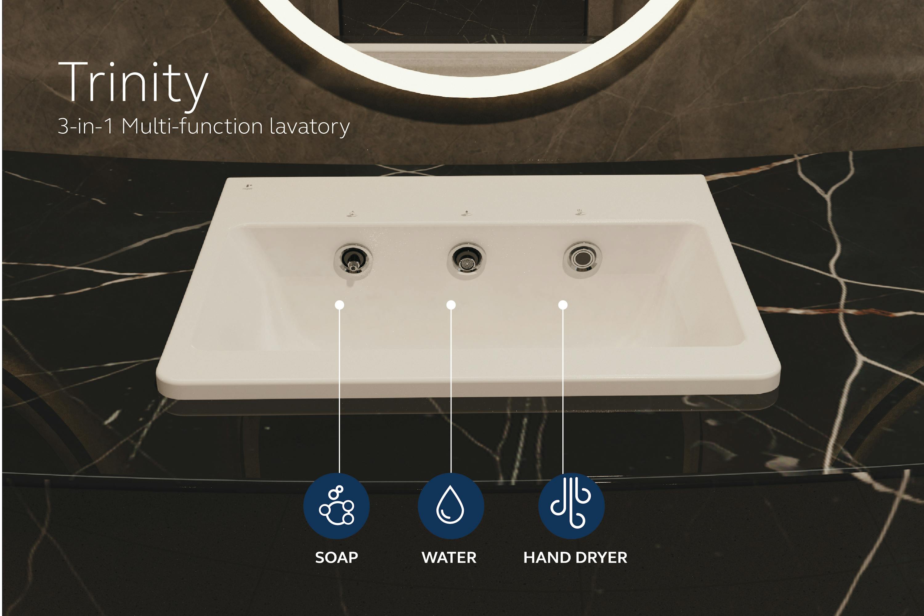 Trinity is our innovative basin design, enhances your hand cleaning experience by incorporating a combination basin equipped a sensor tap, sensor soap dispenser, and hand dryer, elevating it to new levels of excellence.