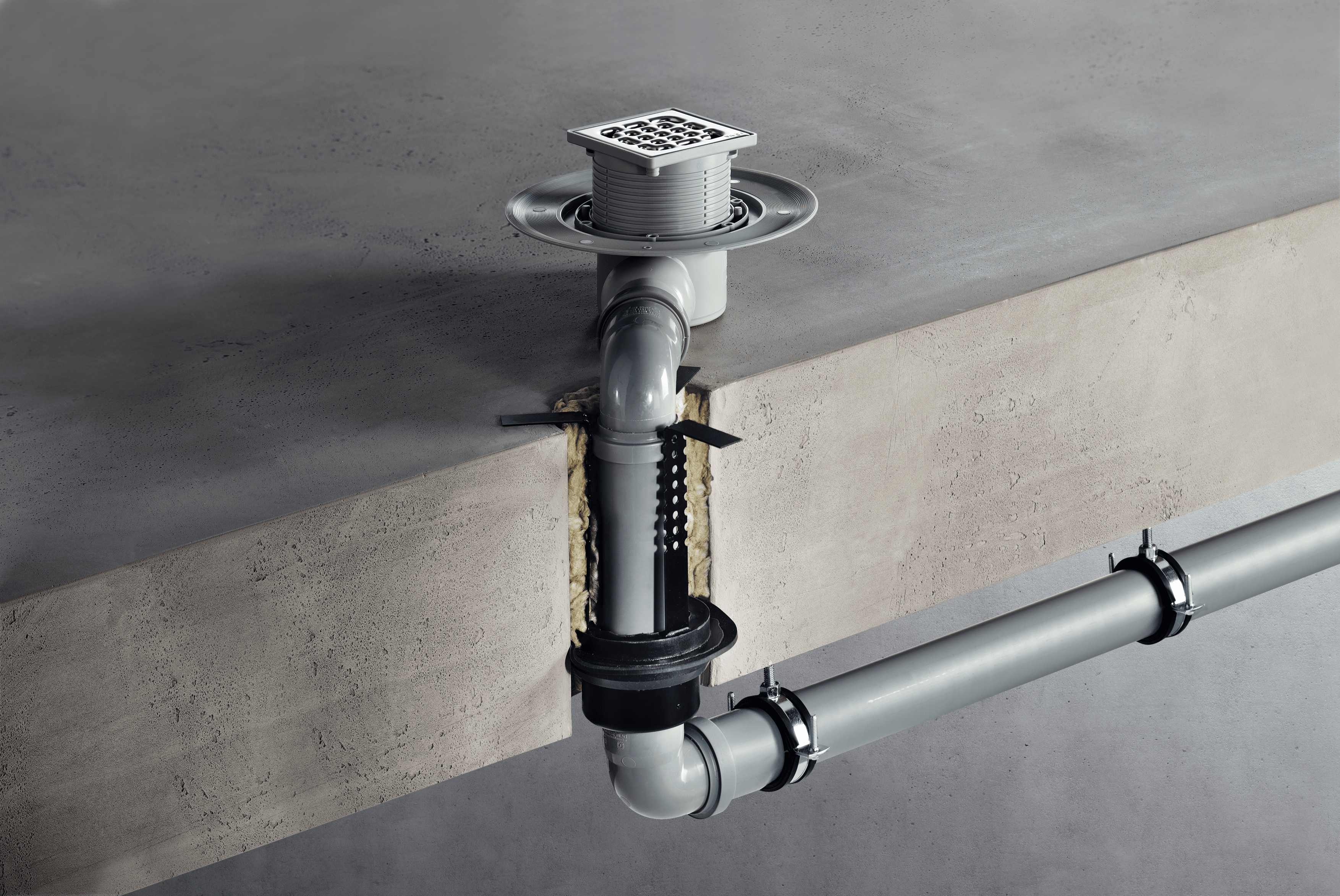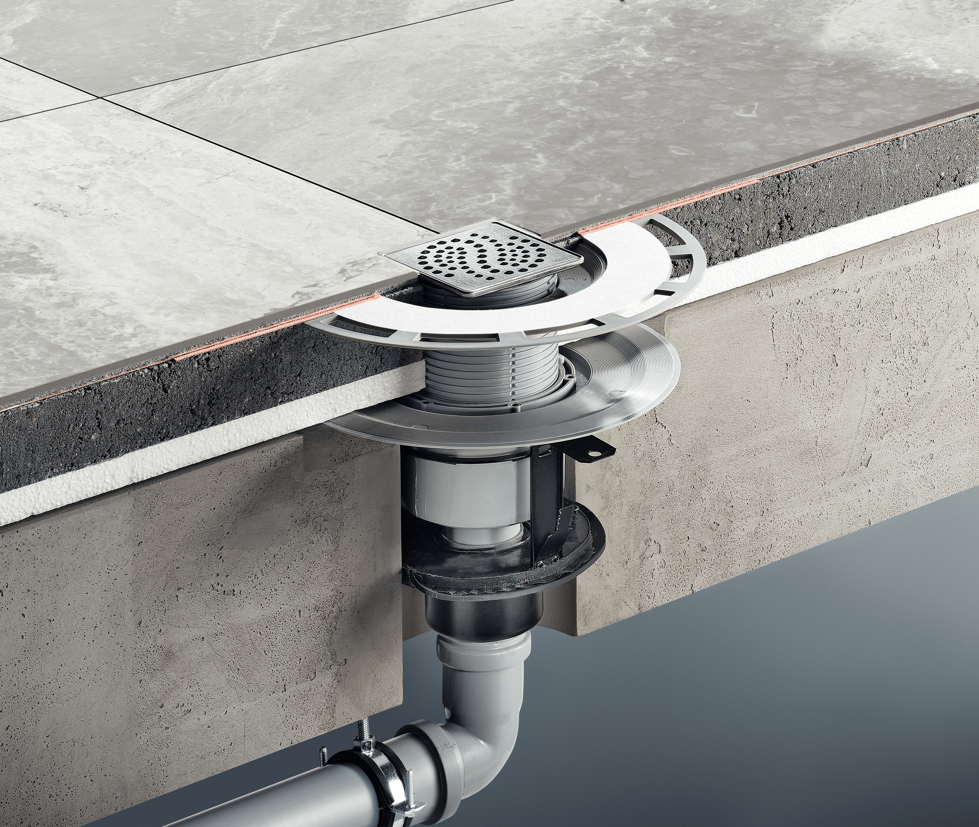 Both Advantix bath drain R120 and Pipe lead-in R120 can be installed in floors at least 150mm thick (including bonded screed / floor installation panels, etc) through drill holes.