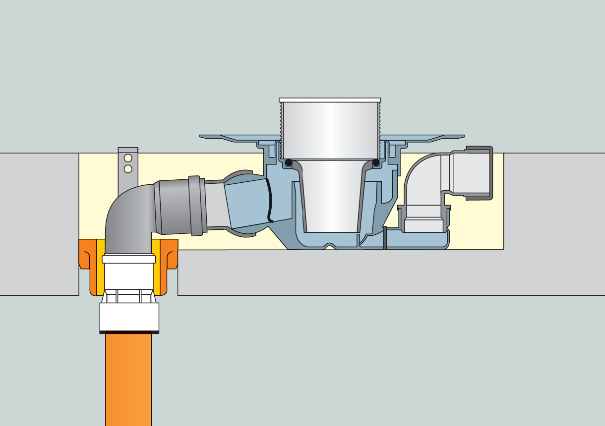 In a fire event, where the drainpipe may had melted away, the Advantix bath drain R120/pipe lead-in R120 swelling compound will start expanding and seal the opening. Its mortar anchors of the fire protection sleeve firmly secure the floor drain in place, creating a closure to prevent further spread.