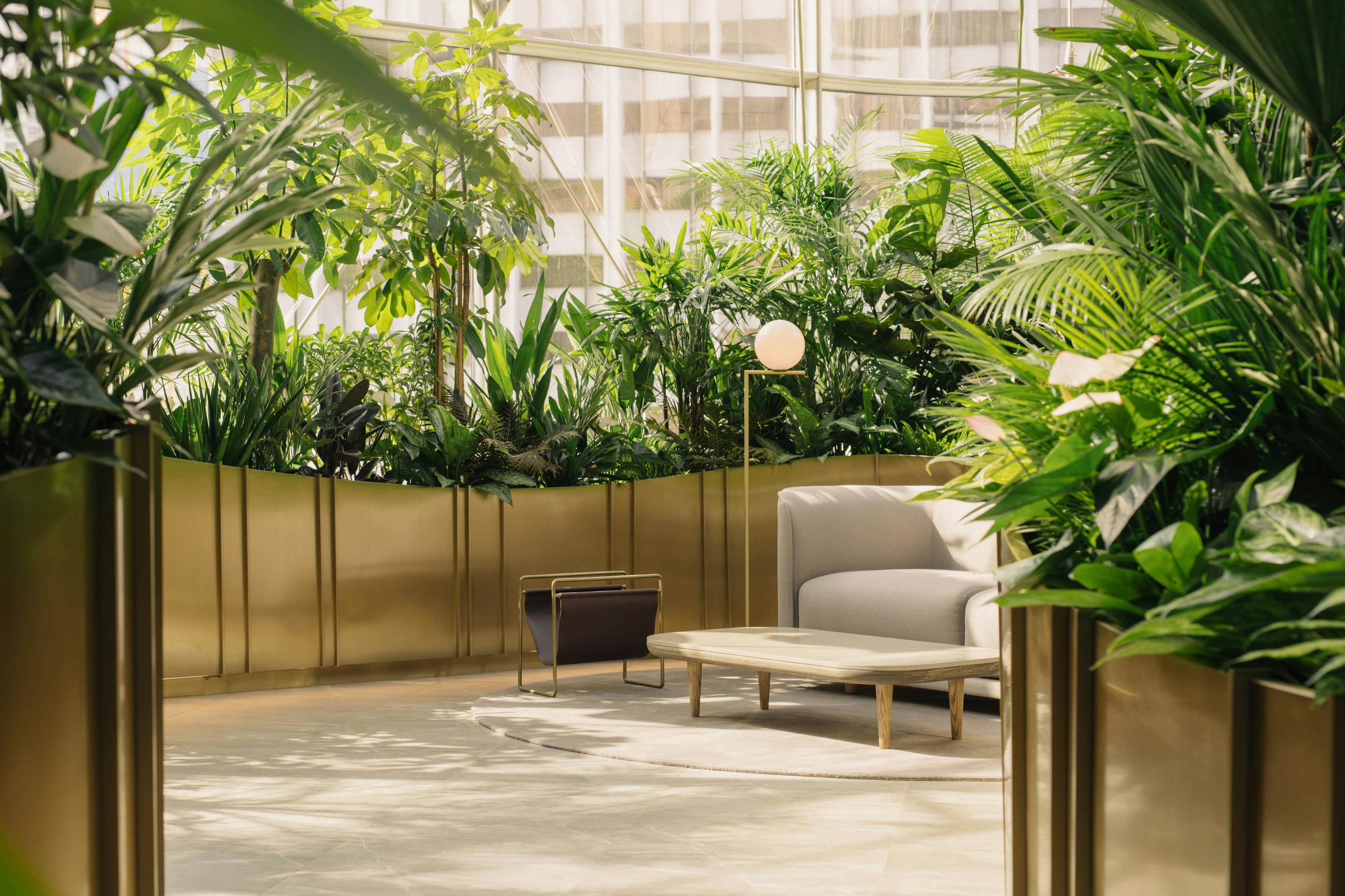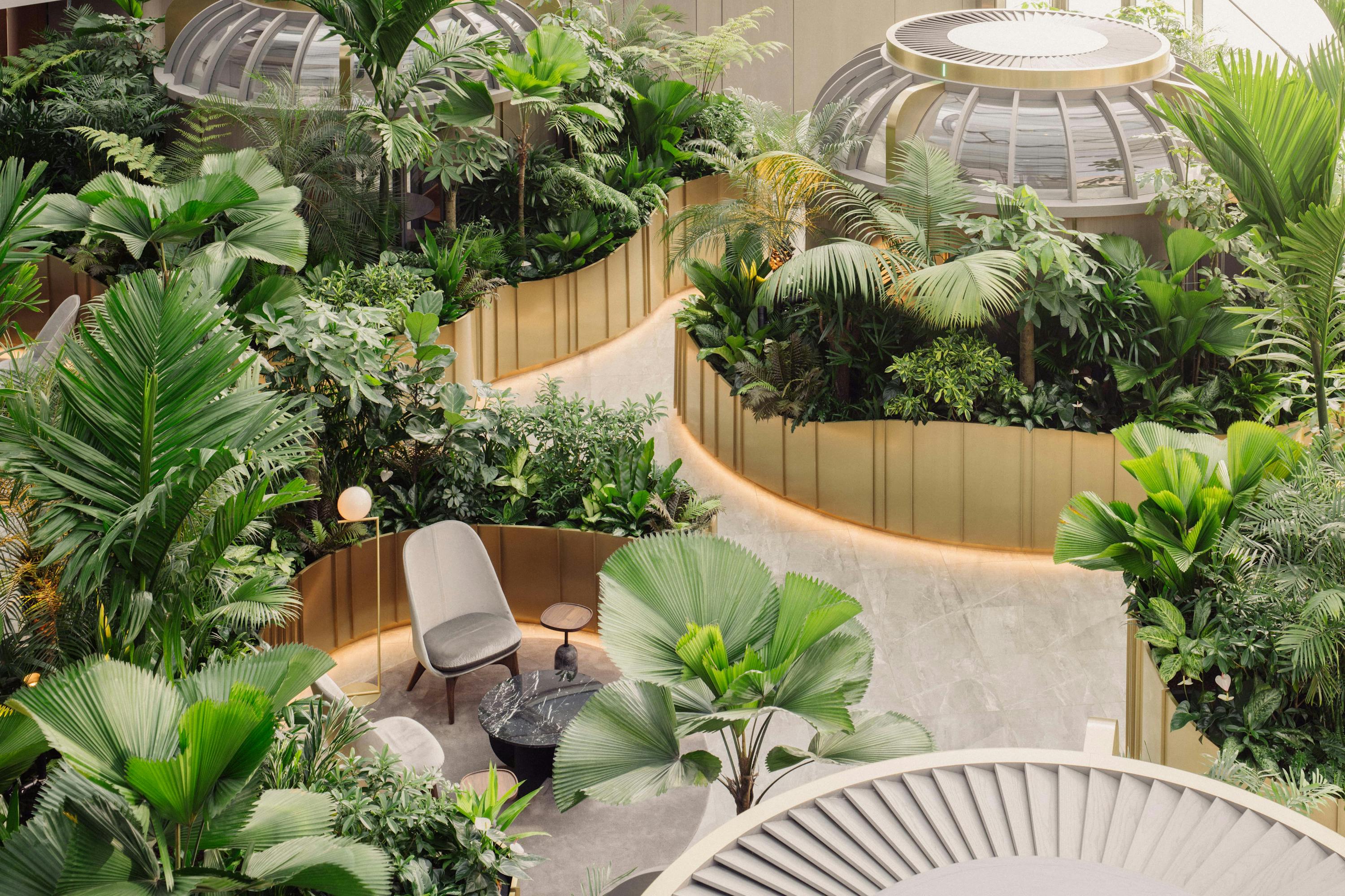 The lush planting surrounding the pods is intensely layered with the intent of creating a genuine botanical experience through hue, scale and texture. The plant species are resilient in indoor environments and variable levels of light and shade, grown using a hygienic hydroponic base. Wrapped in a hairline brass ribbon gently floating above a lit brushed-metal skirting, the garden gradually opens up to reveal Lounge Niches inhabited by contemporary loose furniture pieces inviting the guests to have a seat and enjoy a relaxed conversation.