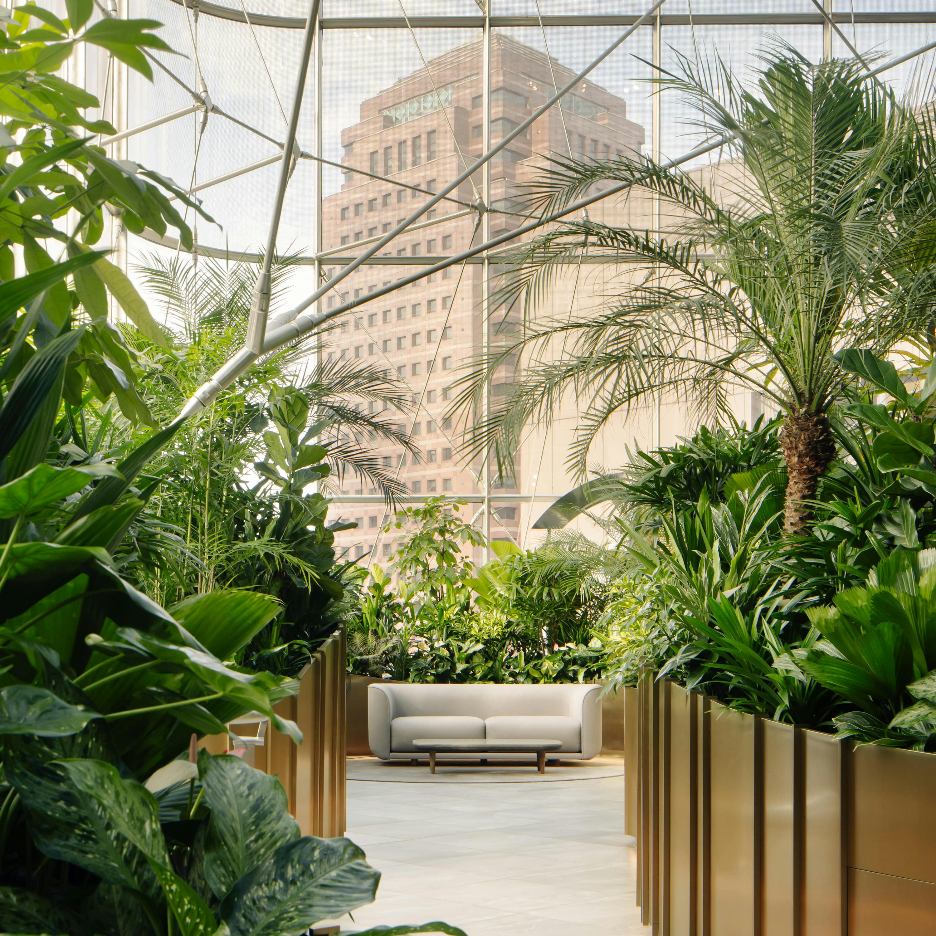 Walking around the space I also noticed how the AC jet nozzle diffusers mounted on the Level 8 fascia were delivering air perfectly at the level of the Level 7 tree canopies, bringing them to life in an uncanny resemblance to an outdoors breeze. Whether by design or purely accidental, this effect further enhanced the notion of the baking conservatory as an authentically biophilic space, with visual, experiential and conceptual transparency between indoors and outdoors entirely aligned and clearly established.