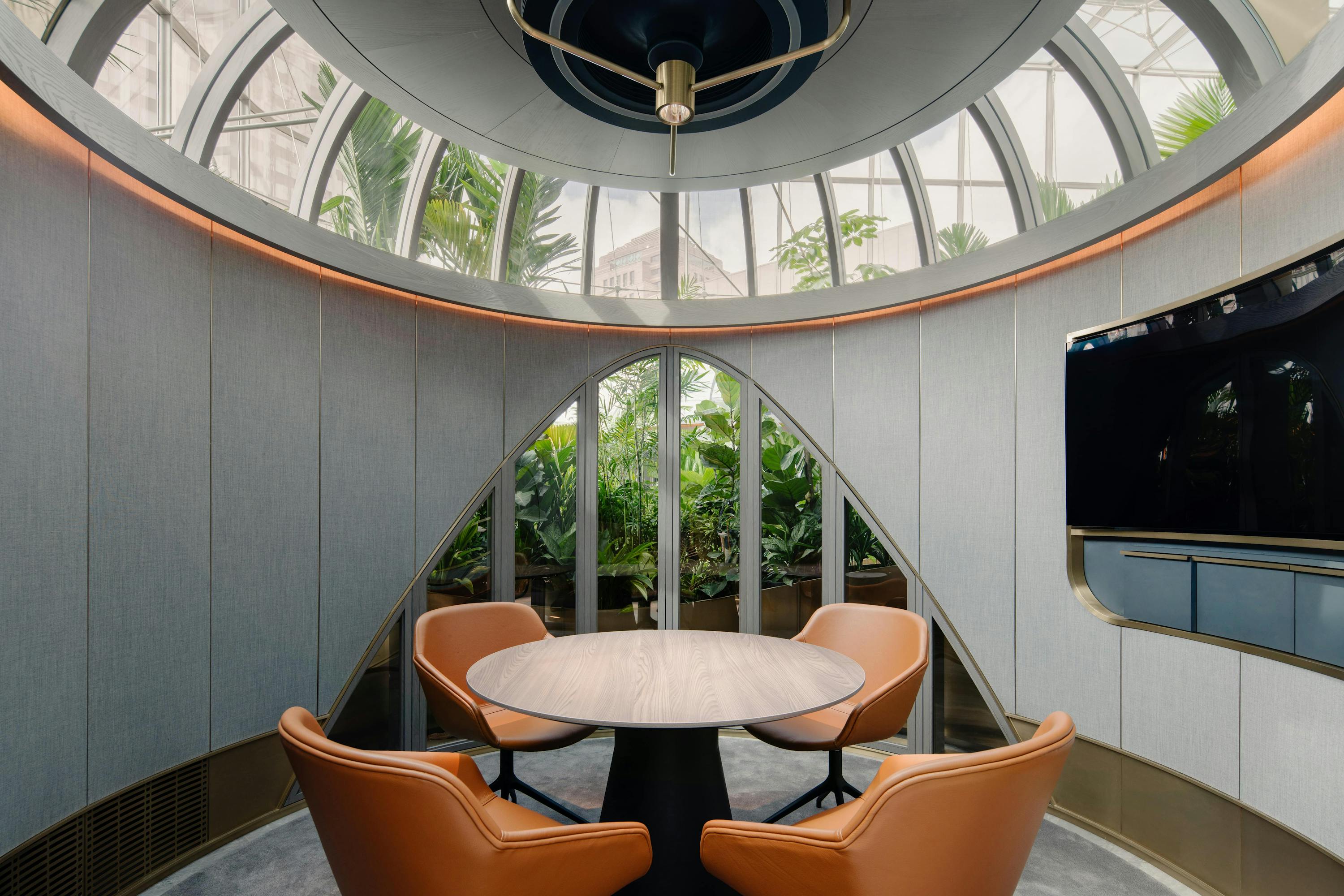 The most striking features are the Garden Pods, whose conceptualisation and execution shows a deep commitment to quality in design resolution. Nestled amongst the lushly planted gardens on Level 7, the circular pods of about 4m in diameter and 3.2m height provide a great balance of privacy and visual connectivity to their surroundings. Acoustic fabric finishes balanced with timber laminates, glazed panels and metal accents achieve a very comfortable visual and aural environment inside the space whilst making a reasonably small enclosure feel luxurious and spacious.