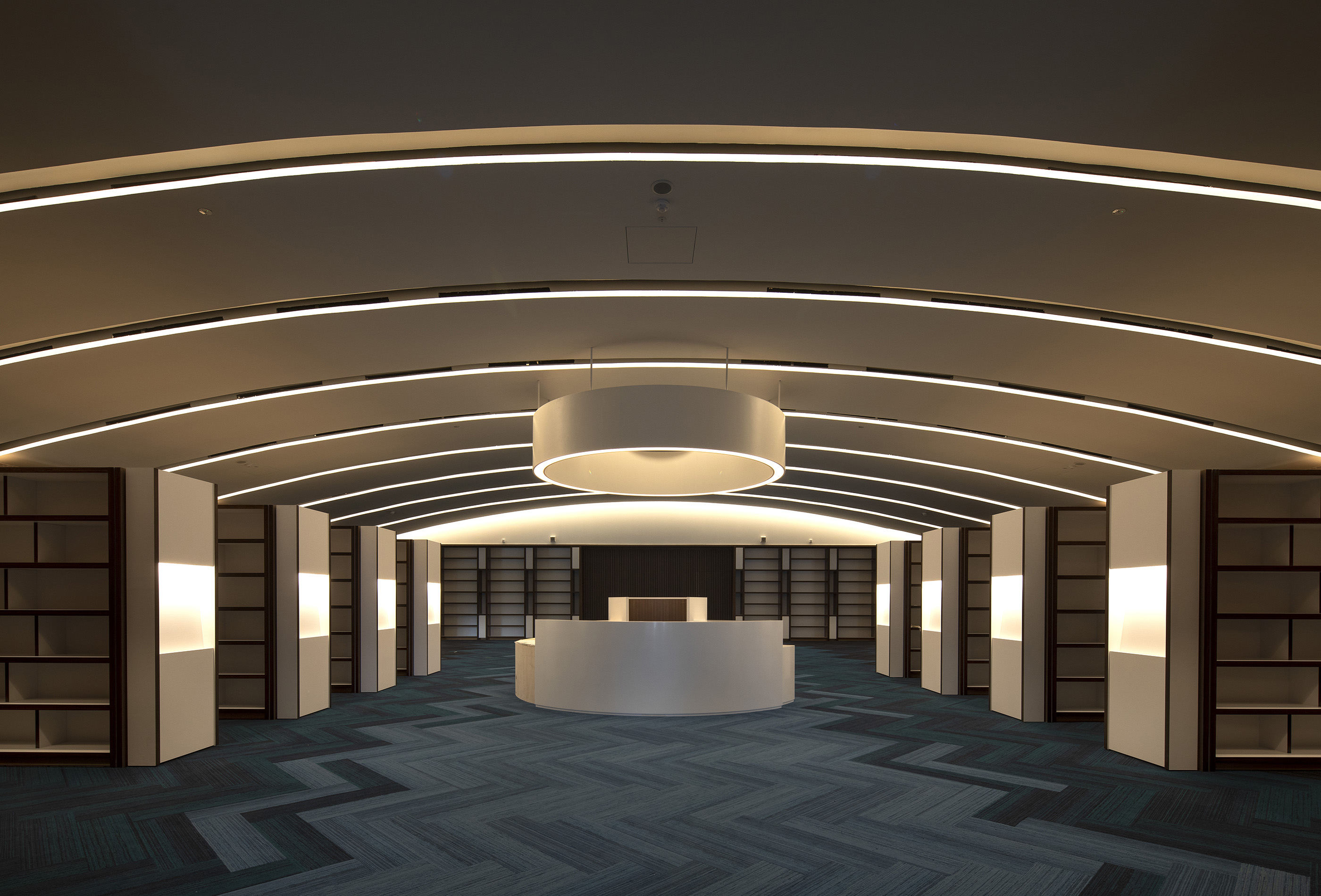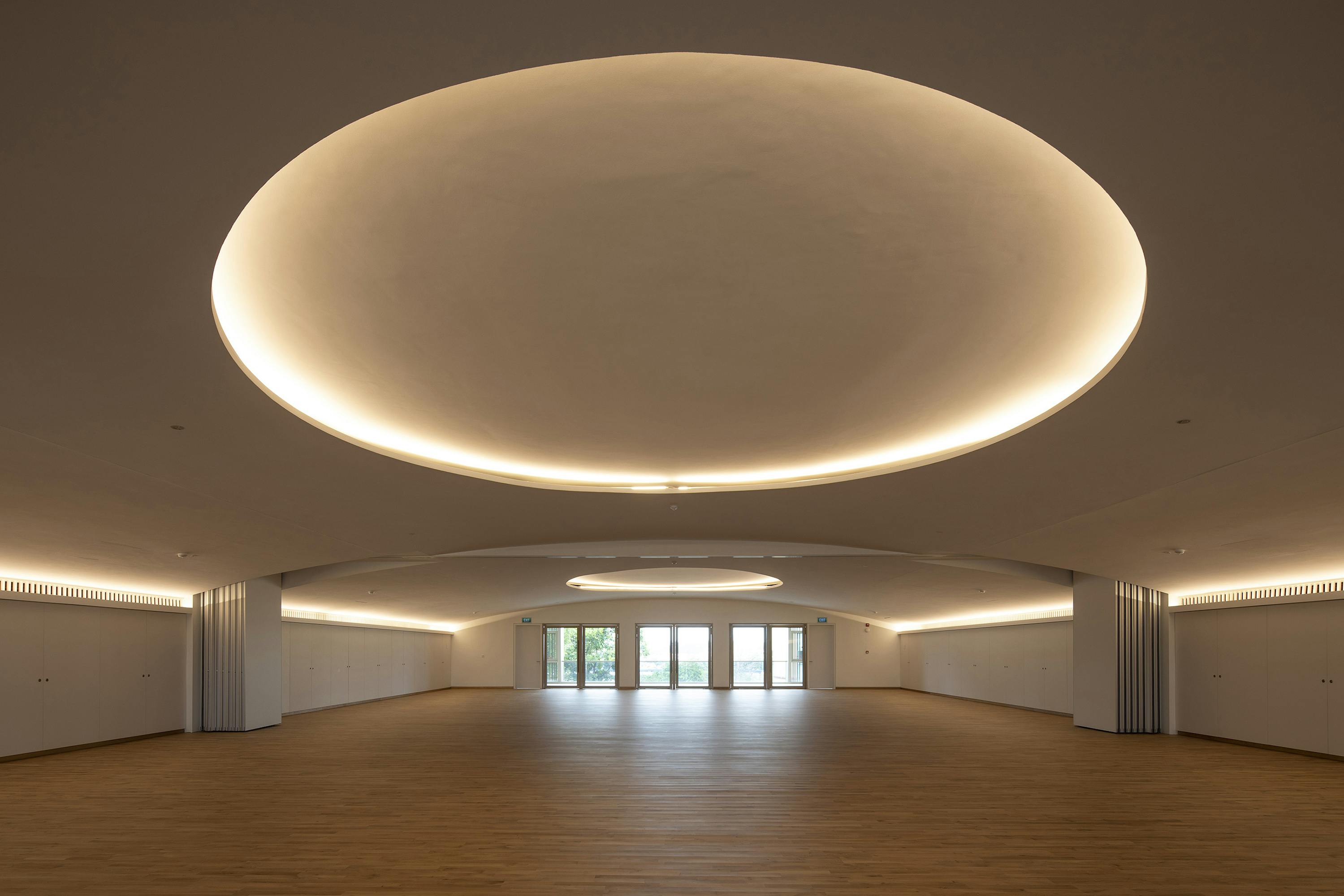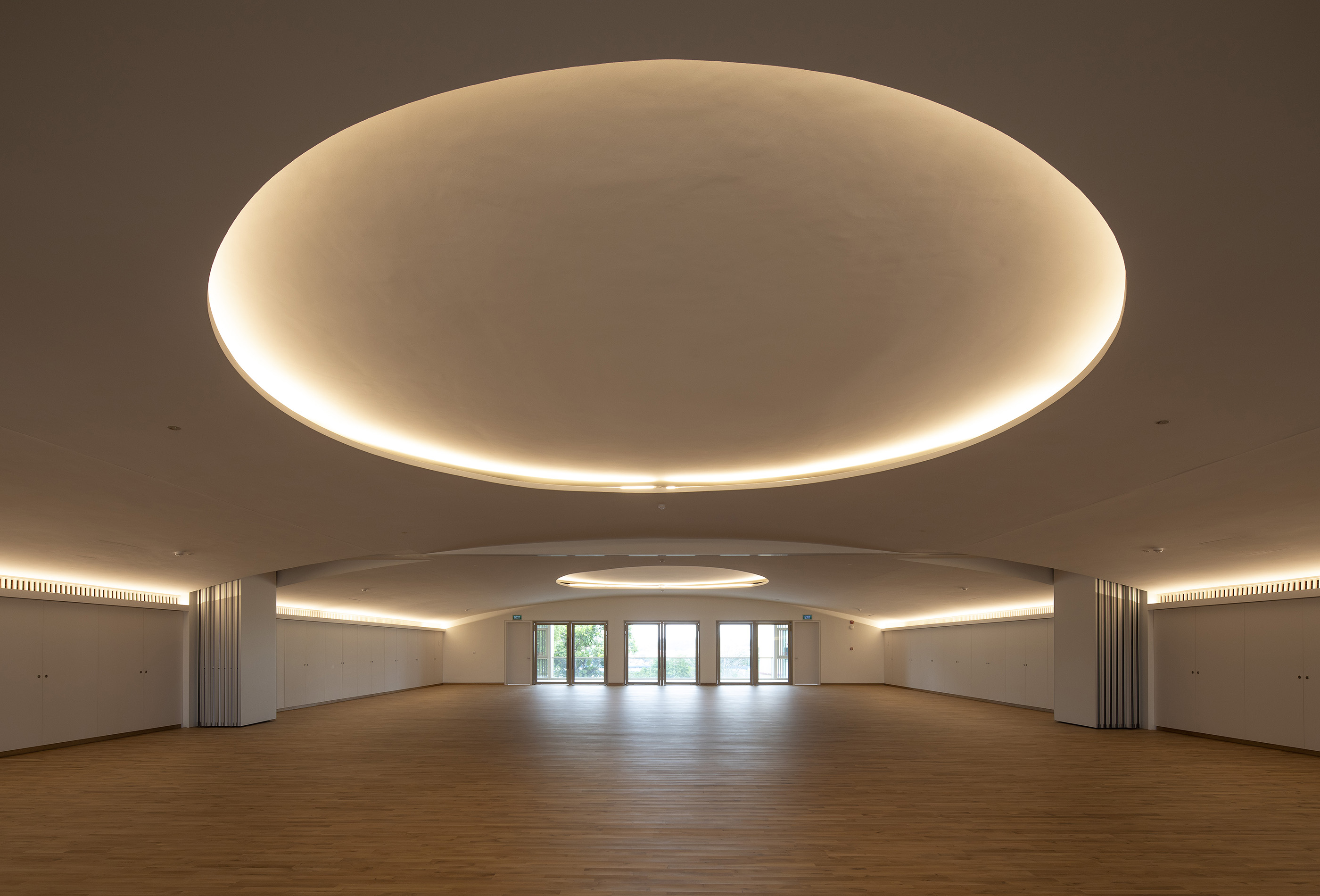 Keeping in mind its secular nature, the meditation halls are clean and symmetrical; devoid of all features save a circular dome ceiling which creates a central focal point. The dome ceiling acts as an architectural device not only to create a singular focus by drawing the eyes upwards, to the centre but also has acoustic properties that captures and amplifies sounds within the space. Precisely calibrated diffused lighting enhances the atmosphere of the sanctuary and imbue the space with an ethereal quality.
