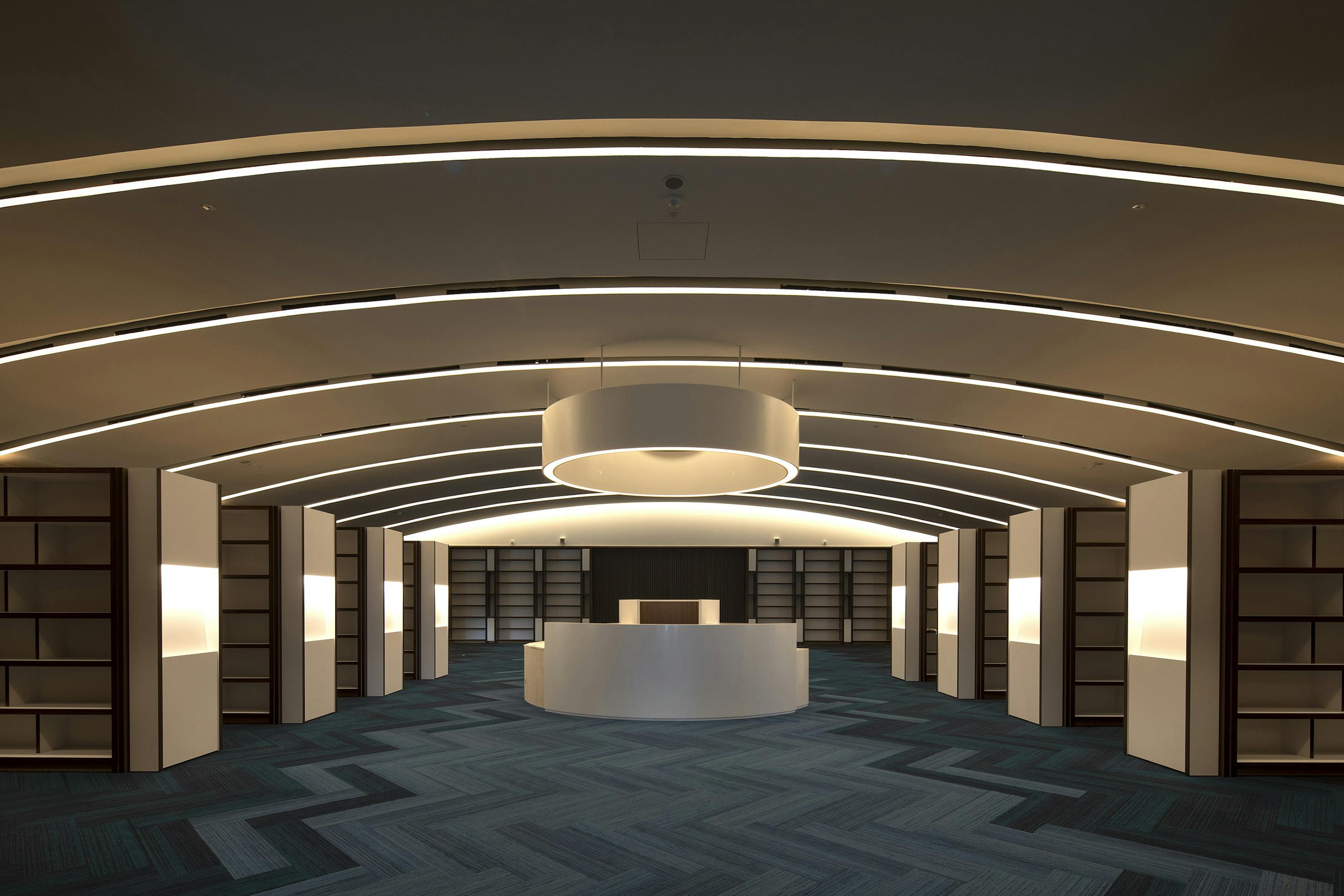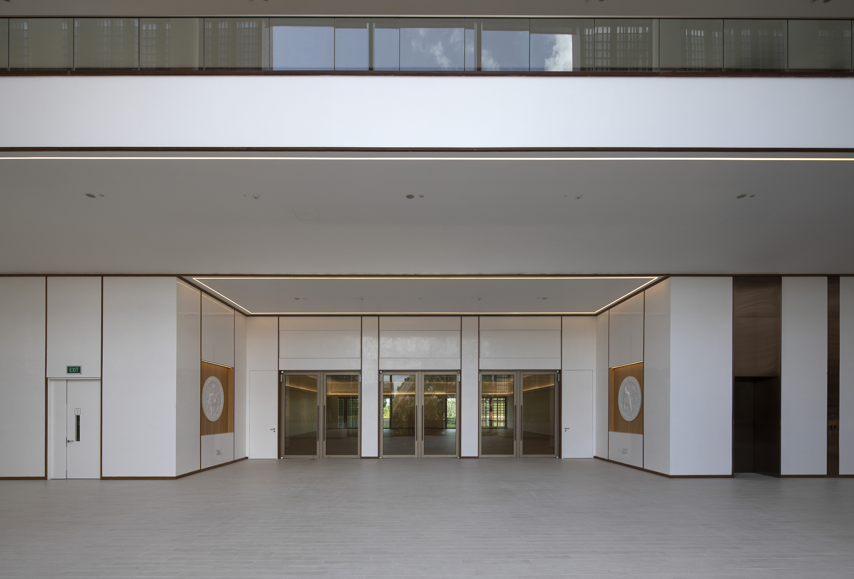 As one journeys through the building to the main meditation hall, there is a series of curated spatial compressions and expansions. From the grand arrival at the main entrance foyer, to taking the lift upwards in a confined space, to transitioning past the high-volume lobby area, one finally enters a phenomenal domed ceiling hall, where the realm of meditation resides. The transition from external to internal is not only physical and metaphorical but manifested in the architectural details as the building begins to shed the punctuations and hard edges of its exterior façade, revealing white surfaces, curved ceilings, and contiguous strip lights to minimise distractions within the interior.