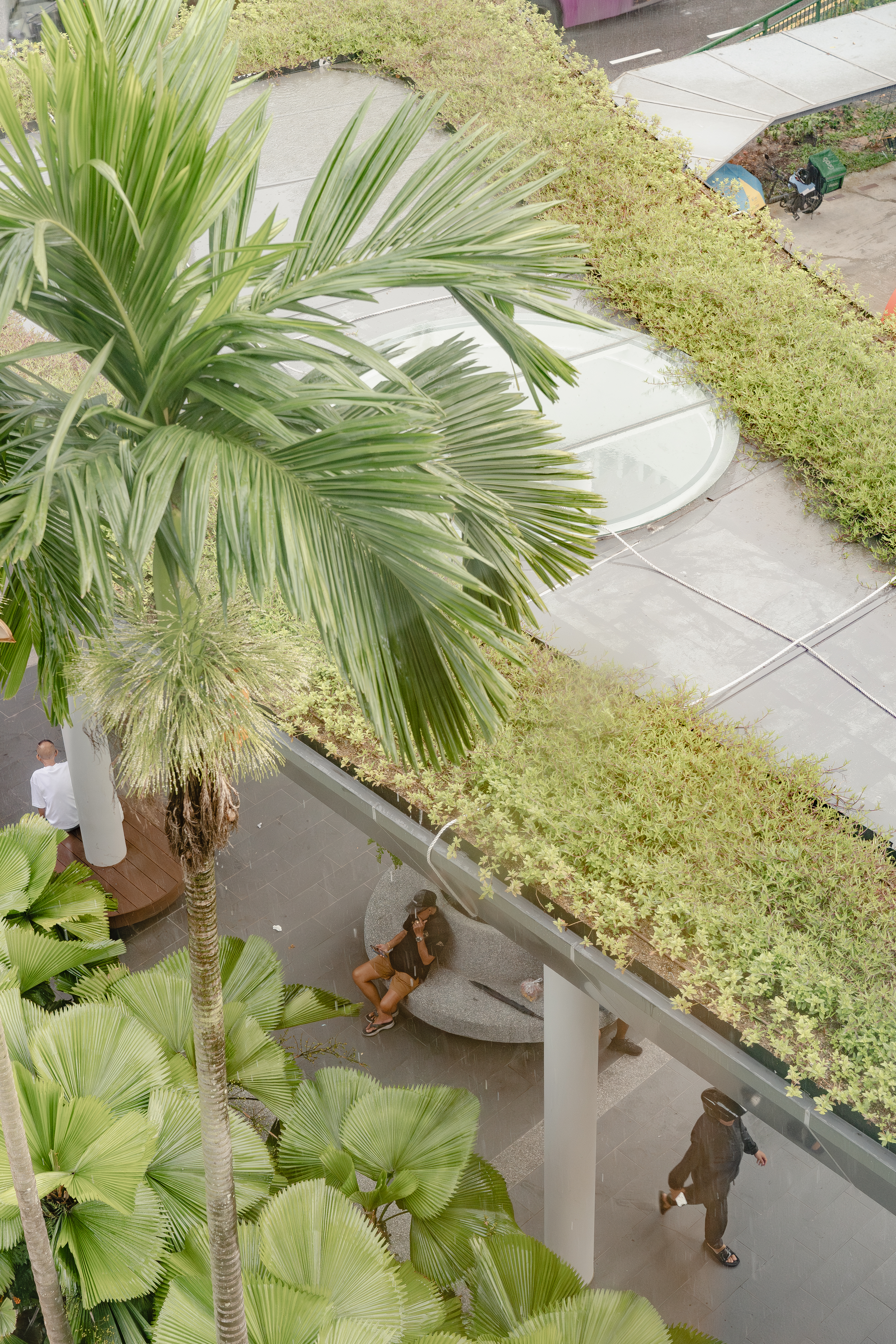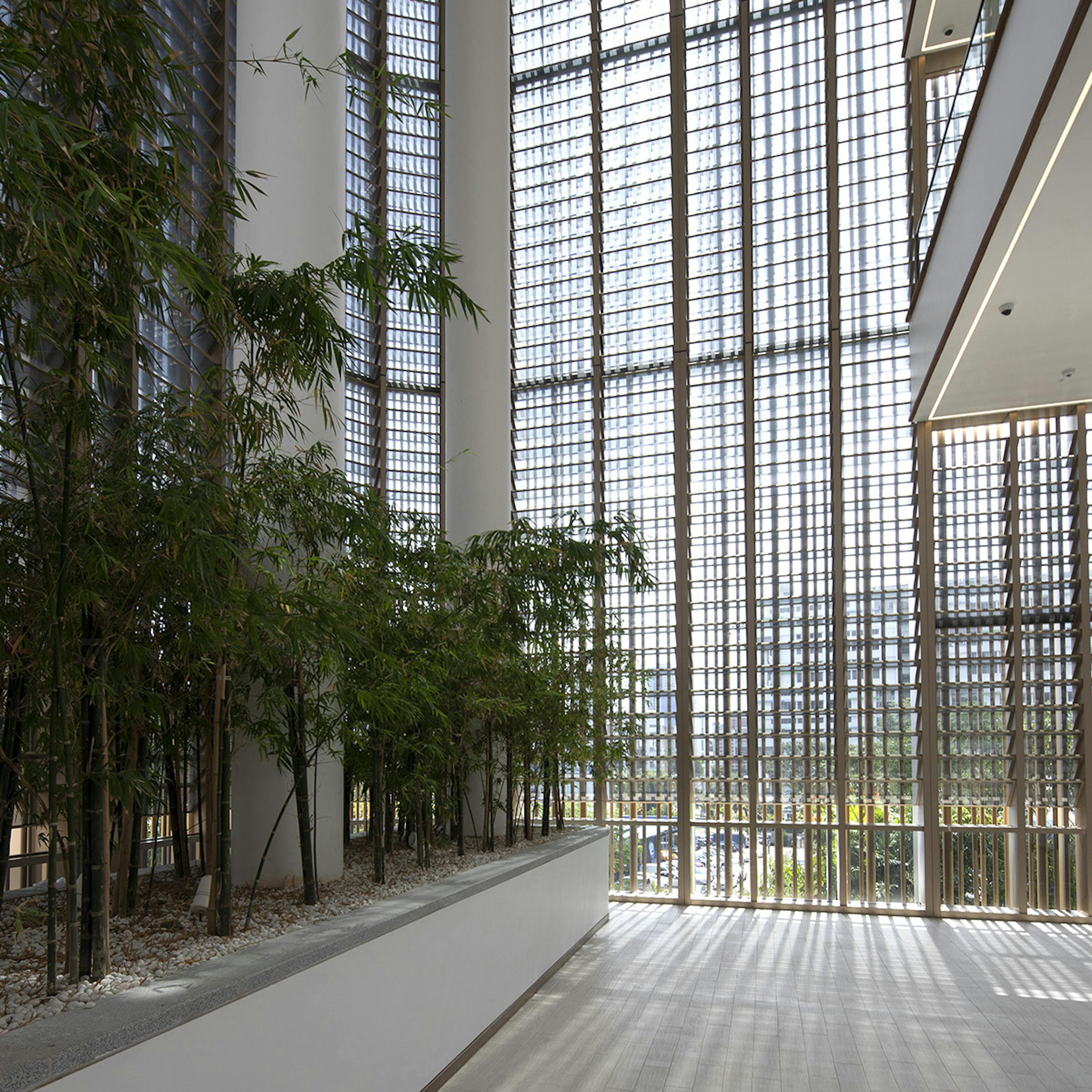 Traversing along the naturally ventilated verandas, the articulation of the façade screens come into focus, revealing its their performative role beyond aesthetic. Internally, a row of glass louvres line and shield the building from the weather while allowing natural light and air to permeate through. Externally, a porous epidermis comprising of dense vertical rods of differentiated hues and sections wraps around and unifies the entire building. The three-dimensional screen mimics a thick bamboo grove, drawing inspiration from nature. Notwithstanding that being one with nature is a tenet of many meditation practices, the landscape is subdued both internally and externally. Perhaps, a metaphorical link suffices as the building stays true to its urban context.