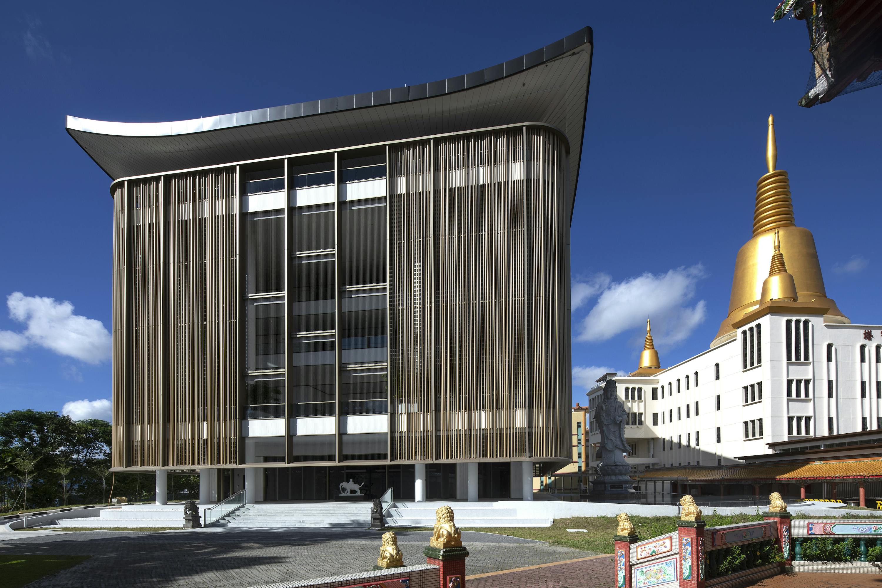 Taking the path through the monastery towards the Meditation Centre is a contemplative ritual; there is a sense of pilgrimage as one wanders along the open sheltered walkways adorned with traditional Chinese embellishments up a gentle hill, through the plethora of traditional Chinese temple forms and religious icons within the site. In contrast to its surrounding predecessors with their expressive finial structures and extensive adornments, the Meditation Centre is a cleanly carved single volume mass, wrapped tightly with a contiguous facade skin. The building is free from ornamentation, in line with its secular disposition. However, unlike some modernist religious buildings that are void of all traces of idioms in the pursuit of a pure, contemporary building, Founding Director of Forum Architects, Ar. Tan Kok Hiang MSIA, posits that it was crucial that the interpretation be connected to the historic site as well as share a visually coherent language to assimilate into the community of buildings within the monastery. This respectful approach sees the eaves of the building’s sweeping roof curved and upturned in traditional Chinese temple fashion. This vestigial element allows the building to strike a balance between the modern and the familiar, helping to establish kinship to the community. This delicate balance asserts the building as a product of our time, while contributing to the evolution of building typology in the monastery.