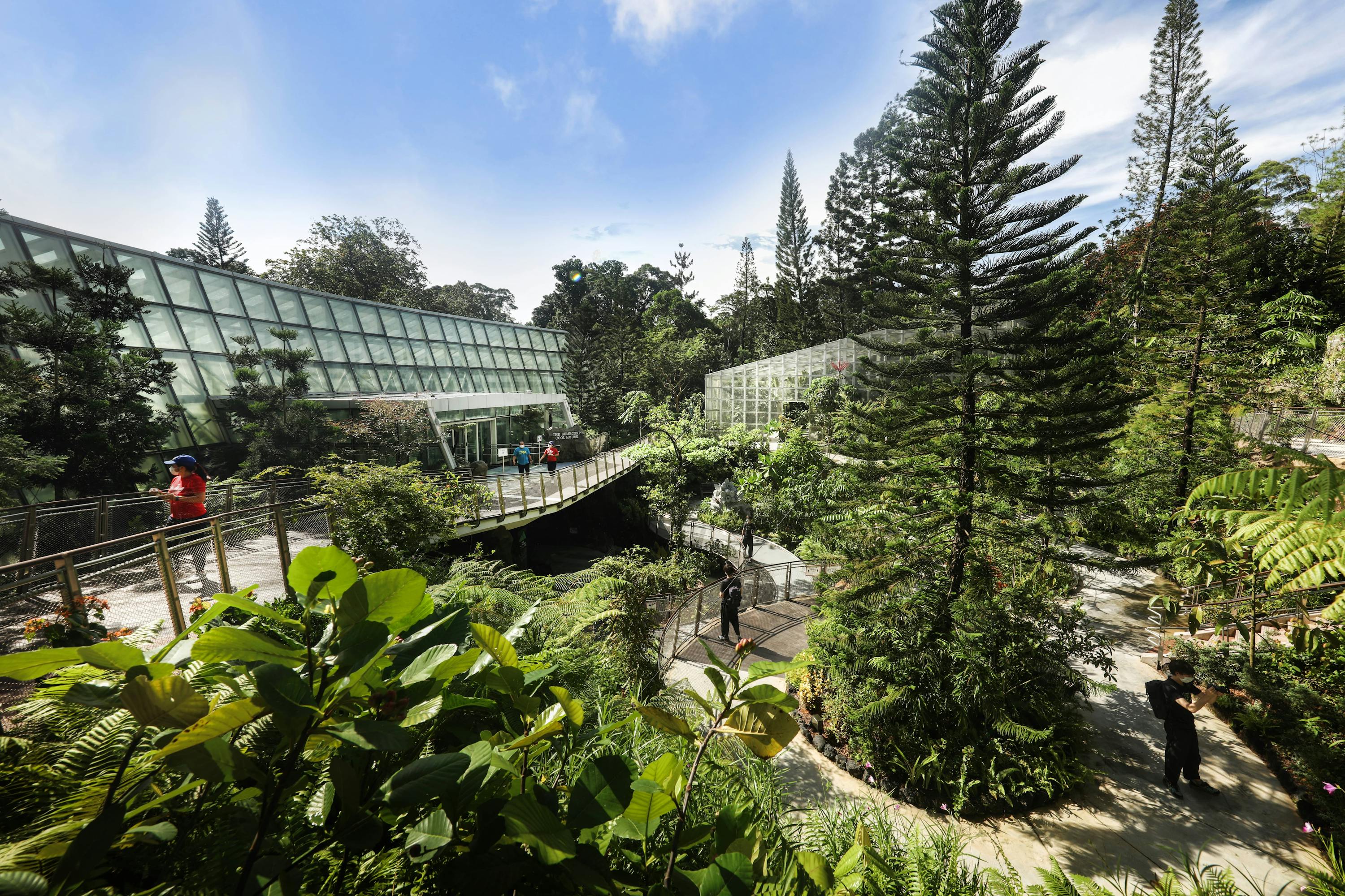 As one descends topographically, climatically the environments shift in an inverse manner from low to high elevation: one is taken through the lowland forests of Singapore and Malaysia, mid-elevation forests featuring neotropical plants like wispy bromeliads and pineapples from South and Central America, and even a secret forest ravine shrouded in mists when the rain falls.