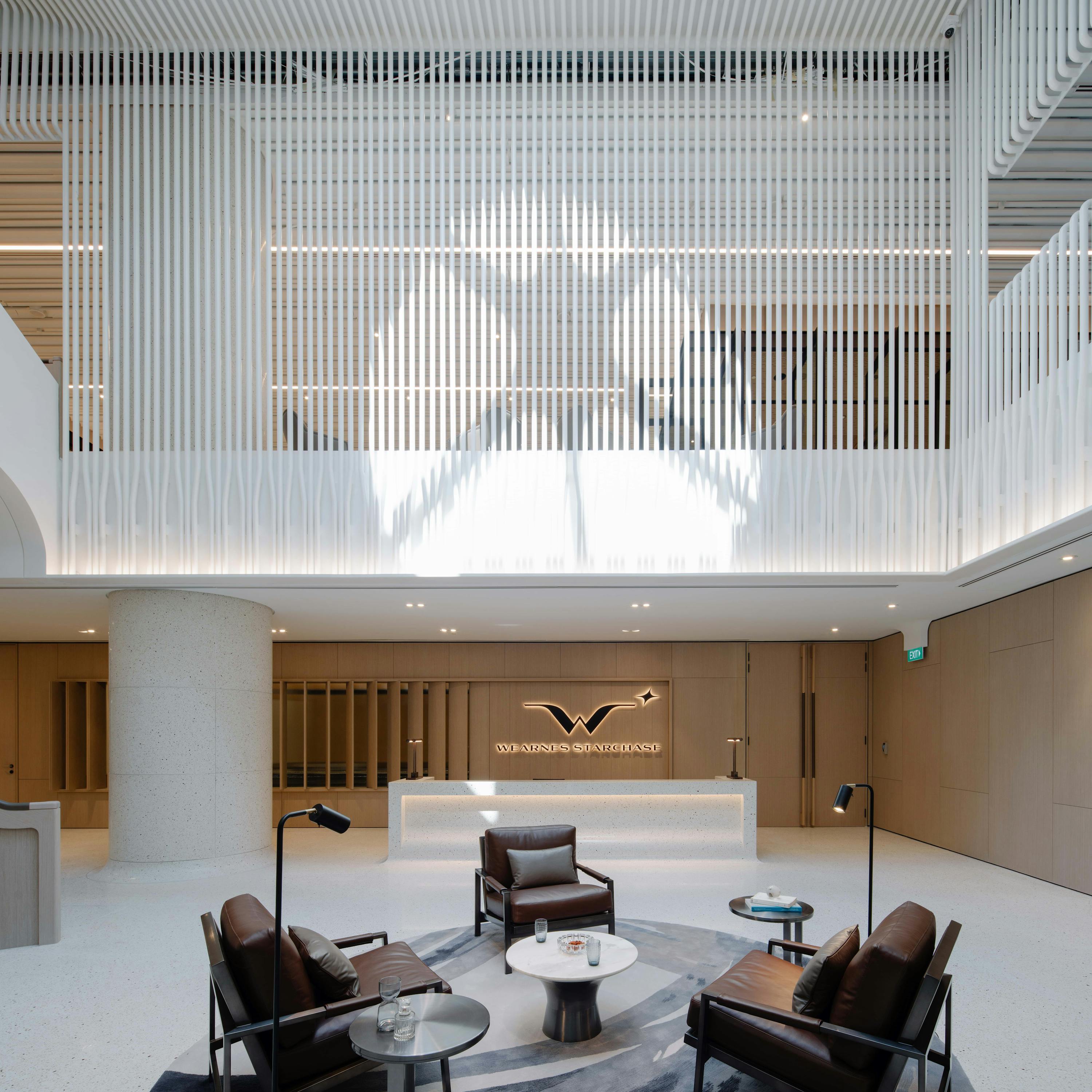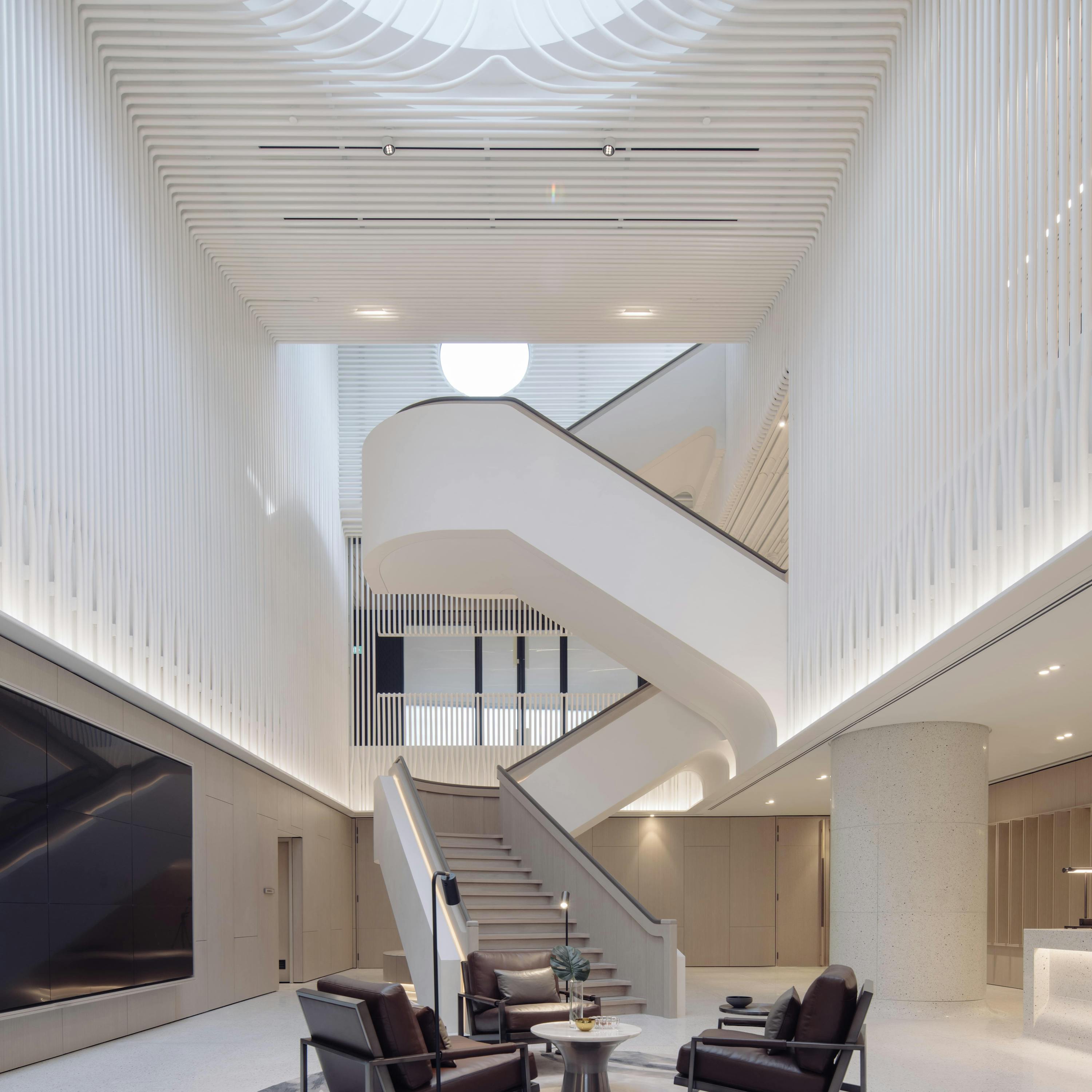 The second veil is embedded within the internal architecture of the project, framing a three-story atrium culminating in a mesmerising oculus at the top. The atrium is the main touchpoint for clients, buyers, suppliers, employees and guests of the company. It is a social space punctuated by well-choreographed seating and finished in a refreshing palette of white, timber and subtle terrazzo.