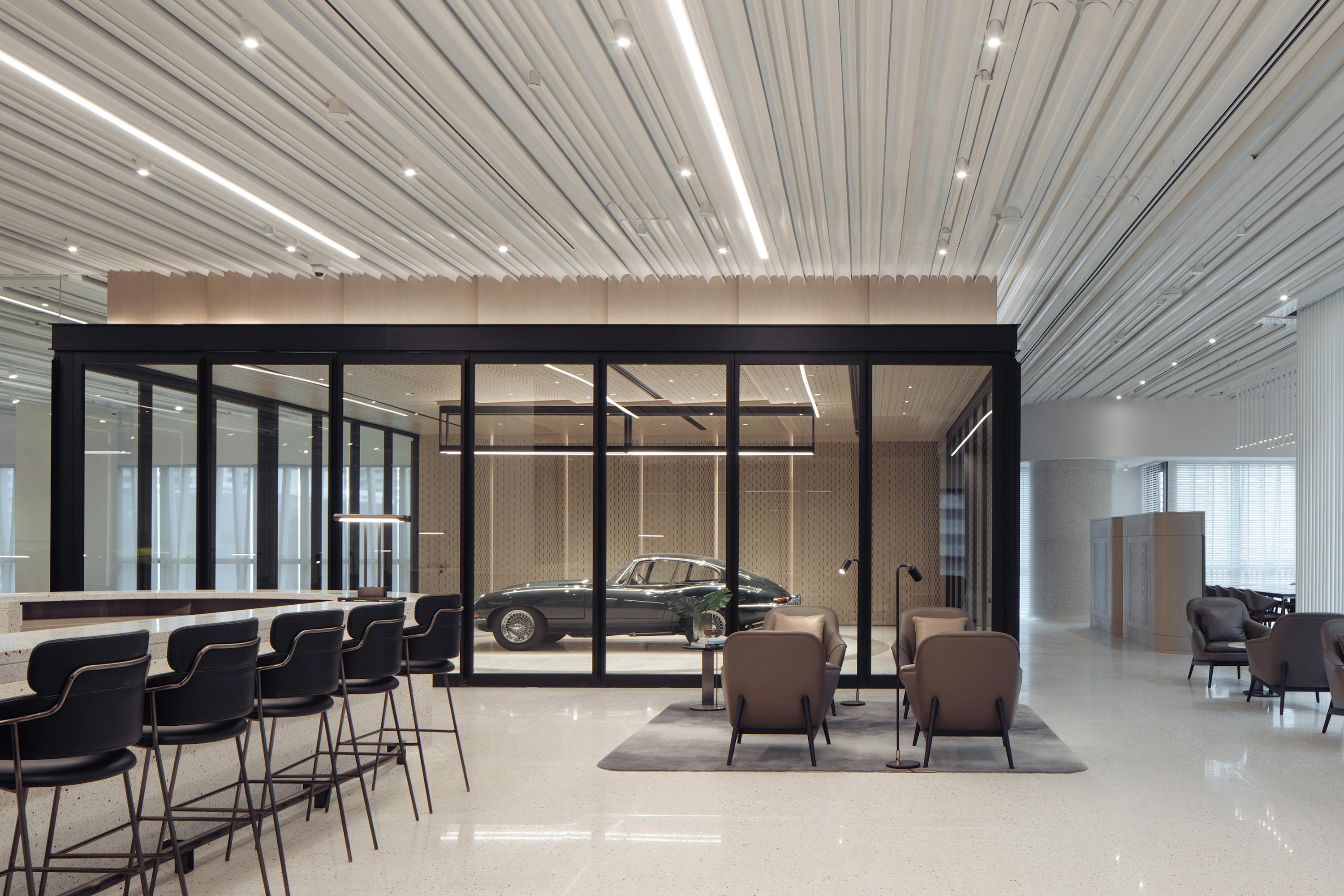 The columns and floor are seamlessly blended as well in terrazzo, making the gradual transition of the surface and light washing on it a profoundly rewarding visual experience. Within the workplace, door handles invite the touch with the same trademark filleted-edge aesthetic seen throughout the project.